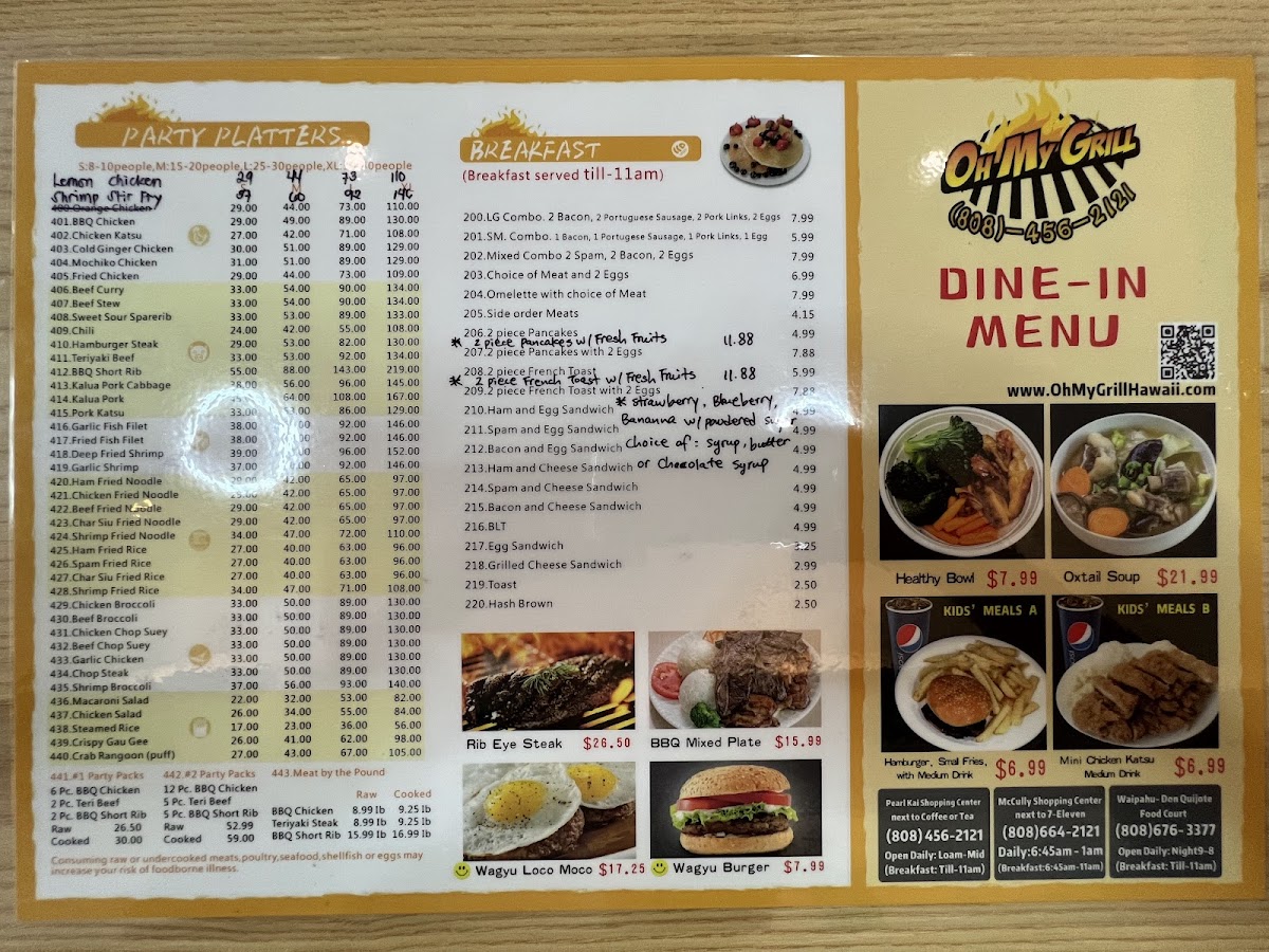 Welcome to OH MY GRILL - Aiea, a culinary gem nestled in the Pearl Kai Shopping Center. This vibrant eatery features an enticing menu that resonates with local flavors and hearty portions. Their Combination Plate Lunches offer delectable options like the Mixed Plate, BBQ Mixed Plate, and Seafood Combo—each accompanied by your choice of rice and salad for just $21.99.